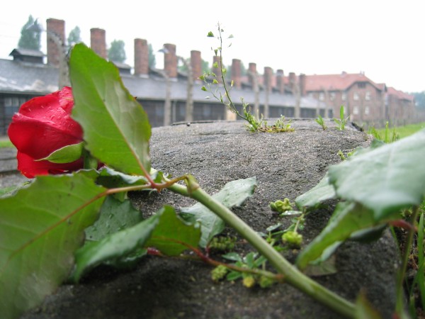 Image of a rose left on a wall at Auschwitz Concentration Camp, a symbol of “hope after terror.” (Puisney, Wikipedia, by permission)